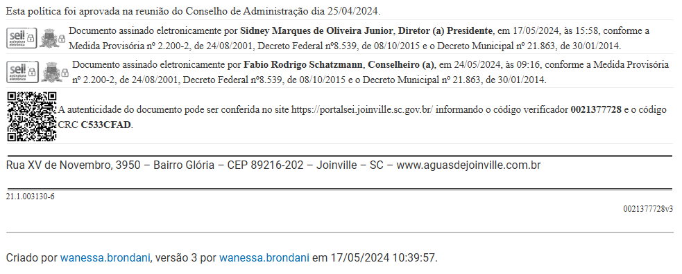 Esta Política se aplica a todos os Administradores, Colaboradores e Cadeia de Fornecimento da Companhia Águas de Joinville.